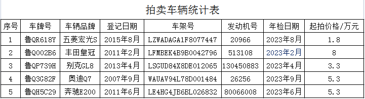 1月17日臨沂奔馳、豐田等五輛車拍賣公告