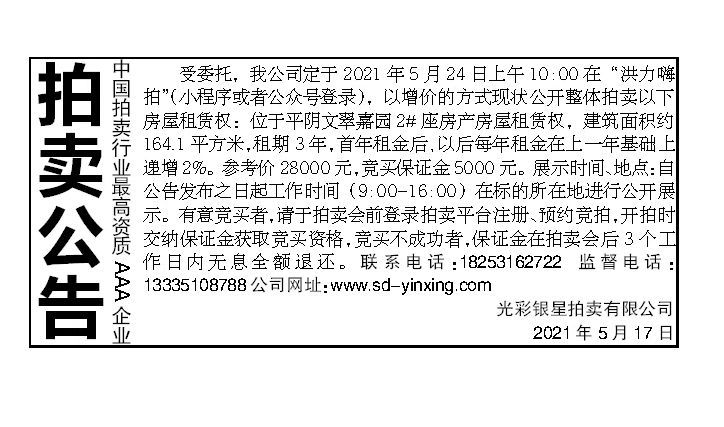 5月24日平陰文翠嘉園2#房產(chǎn)租賃權(quán)拍賣公告
