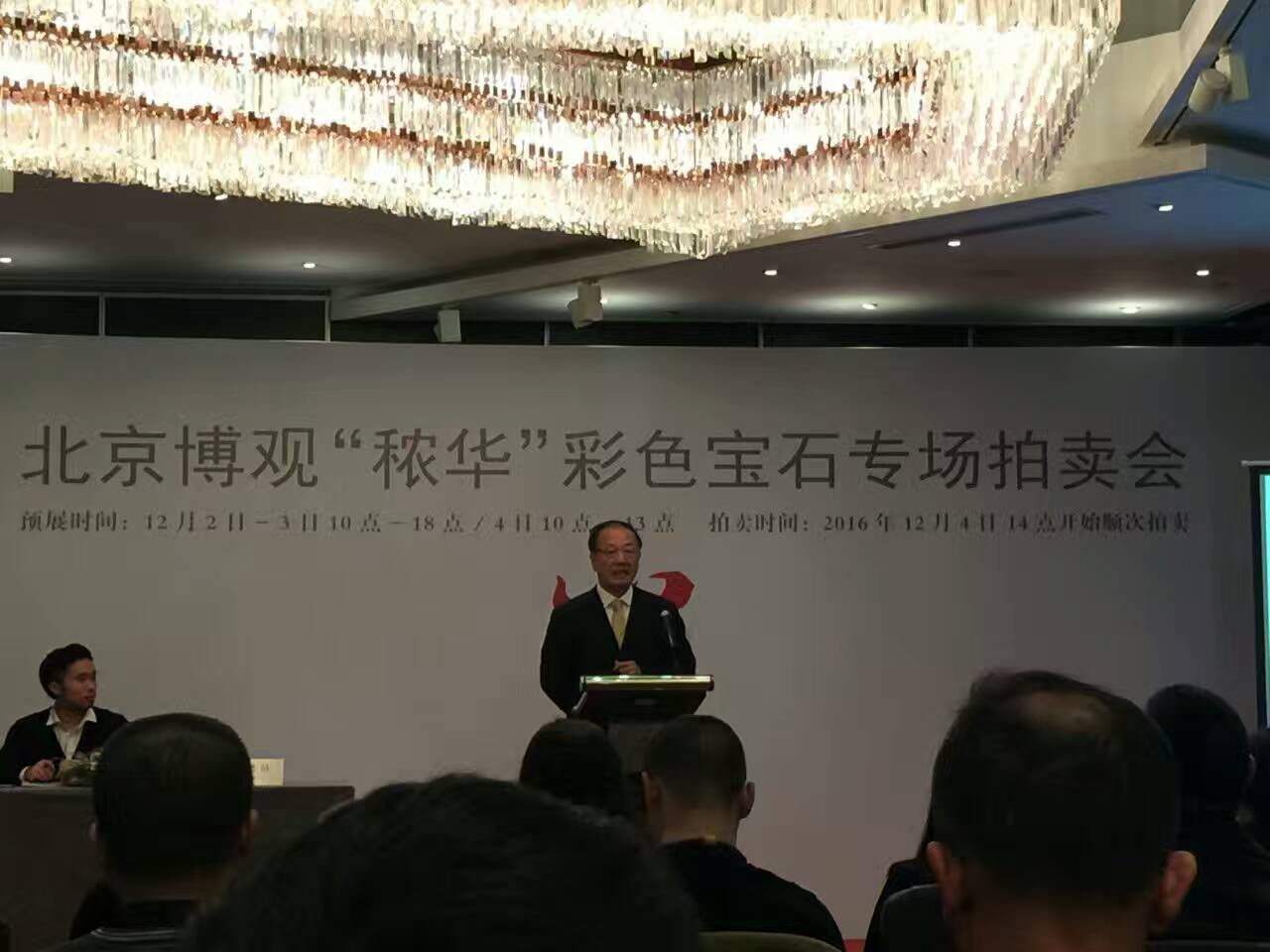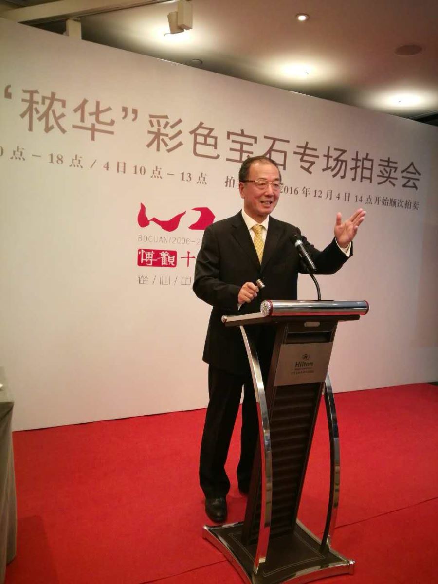 2016年12月4日下午,受博觀拍賣董事長奧巖先生邀請,光彩銀星拍賣董事長、國家注冊拍賣師畢研挺先生在北京王府井希爾頓酒店主持了北京博觀2016“秾華”甄選彩色寶石專場拍賣會,其中一顆88.27克拉的藍寶石以950萬元成交,這場拍賣會開創(chuàng)了彩色寶石拍賣先河。畢研挺拍賣師主持經(jīng)驗豐富、擁有深厚的文化底蘊、主持風(fēng)格沉穩(wěn)大氣,充分體現(xiàn)了中國拍賣師的風(fēng)采。