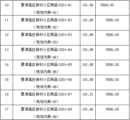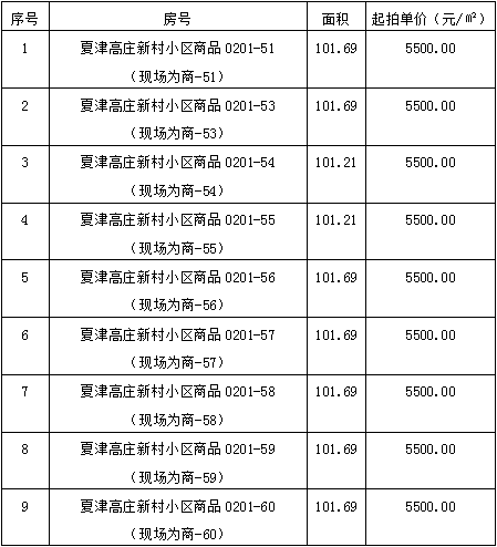 2、夏津高莊新村小區(qū)商品房17套。房產(chǎn)建筑面積為101.21-101.84平方米,參考價(jià)為556655元-560120元。競(jìng)買保證金5萬(wàn)元/間。多賣多交。